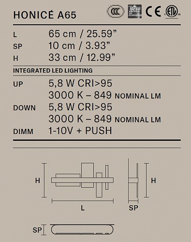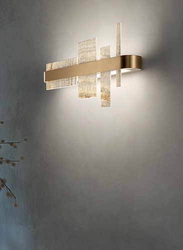 Бра MASIERO. HONICE A65 V99, L=650 мм, цвет матовое золото, украшена рассеивателями из природного оникса, под лампы LED UP 5,8W CRI>95 3000K 849lm и LED DOWN 5,8W CRI>95 3000K 849lm, диммируемый: 1-10V + PUSH.