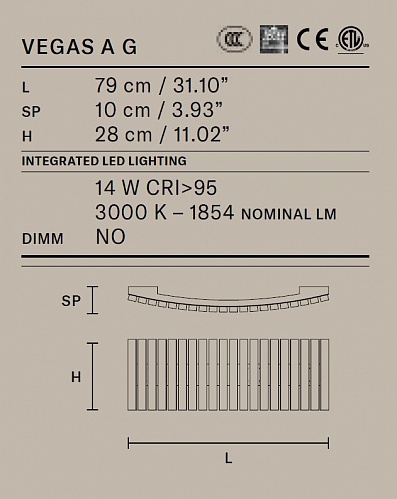 Бра MASIERO. VEGAS A G F04, H=280 мм L=790 мм, цвет шампань, украшена стеклом с эффектом горного хрусталя, под лампу LED 14W CRI>95 3000K 1854lm.