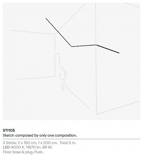 Встроенный источник света. Подключение Floor base & plug. Push. Композиция состоит из 3-х модулей Sticks: 2x1500 мм 1x2000 мм.