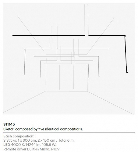 Встроенный источник света. Встроенный микро-блок питания удаленного управления (1-10V). Композиция состоит из 3-х модулей Sticks: 2x1500 мм 1x3000 мм.