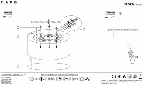 Накладные потолочные светильники Faro. SEVEN, арт 68323, диммируемые, с пультом управления, цвет белый, D=400мм, под LED SMD 20W 3000K 1300Lm CRI>80