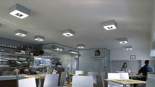 Экструдированный окрашенный алюминиевый корпус. Рассеиватель из поликарбоната. Прожекторы из литого алюминия в стальных коробах черного цвета. Каждый прожектор может быть направлен индивидуально под углом наклона в диапазоне от -10° до +70°, вращения - до 355°.
