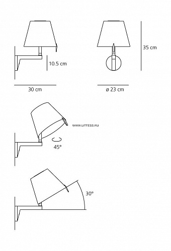 Конструкция из окрашенного алюминия, абажур из шелковой атласной ткани на пластиковой раме. Регулируемый абажур в двух различных положениях. Регулируемая яркость освещения.