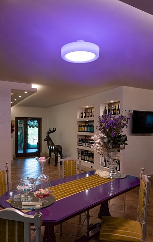 Панель имеет отдельное управление –изменение цветовой температуры от теплого белого до холодного белого и диммирование. Кольцо имеет отдельное управление – изменение RGBW-цвета и диммирование. Интегрируется в систему SLV VALETO и другие системы ZigBee. Угол рассеивания луча 110°.