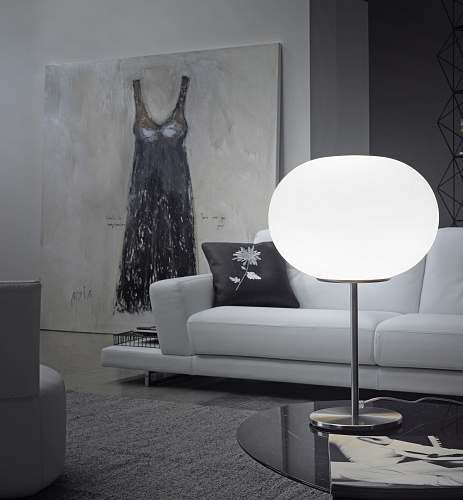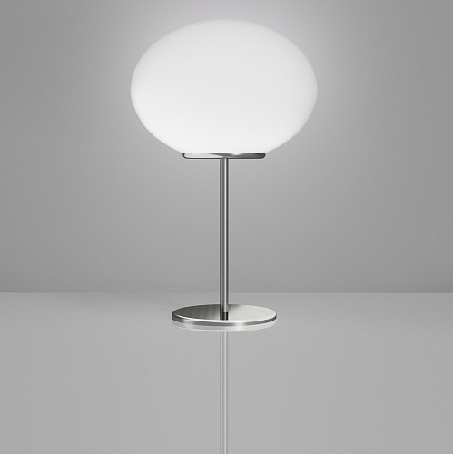 Настольные лампы Vistosi. LUCCIOLA LT 30 P BC/ST NI, сатиново-никелированная конструкция с матово-белым плафоном из выдувного стекла, с переключателем On/Off, H=590 мм, под лампу E27 77W.