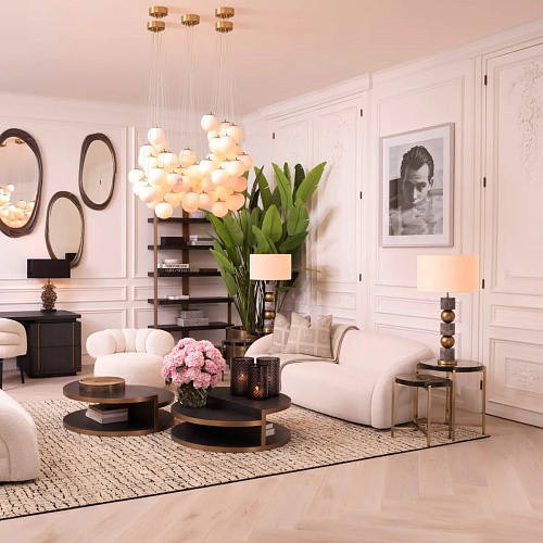 Три красивых элемента из шлифованного серого мрамора чередуются с двумя круглыми сферами, отделанными античной латунью, и подставкой-основанием. Каждая лампа будет уникальной благодаря активности, присущей натуральному камню.