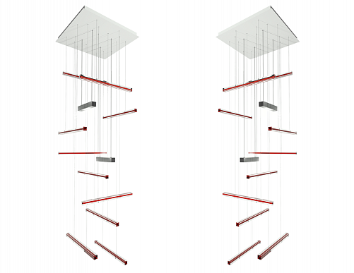 Подвесные люстры AXO Light. EXPLO, Модель SP EXP Q 10 RS XX R7S, отделка белый/сталь, украшена стеклянными красными стержнями из муранского стекла, H=2900 мм L=590 мм W=590 мм, под лампы 2xR7S 120W (118).