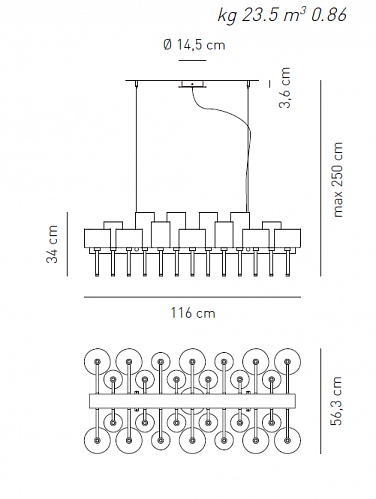 Подвесные люстры AXO Light. SPILLRAY, Модель SP SPIL 26 CS CR 12V, хромированная конструкция с прозрачными плафонами, диммируемый, H=340 мм L=1160 мм W=563 мм, под лампы 26xG4 10W 3000K 12V.