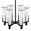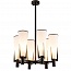 Эта характерная люстра с бронзовой подсветкой подвешена на штанге. В комплект входят 6 конических плафонов из белого стекла с бронзовым ободком.