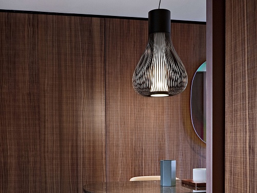 В этой версии излучение света можно регулировать с помощью механического механизма, который открывает жалюзи, изменяя тем самым форму светильника. Стальной подвесной трос, шнур питания из FEP/ ПВХ того же цвета, что и светильник.