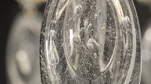 Металлическая конструкция, покрытая стеклянным профилем и украшена подвесками из стеклянных элементов Crek (имитация горного хрусталя).