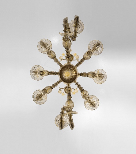 Подвесные люстры SYLCOM. REZZONICO Модель 1472/8/PO/FU/ORO, позолоченная металлическая конструкция, отделка дымчатым стеклом и золотом 24 карата, H=1120 мм D=1360x860 мм, под лампы 8xE14 40W.