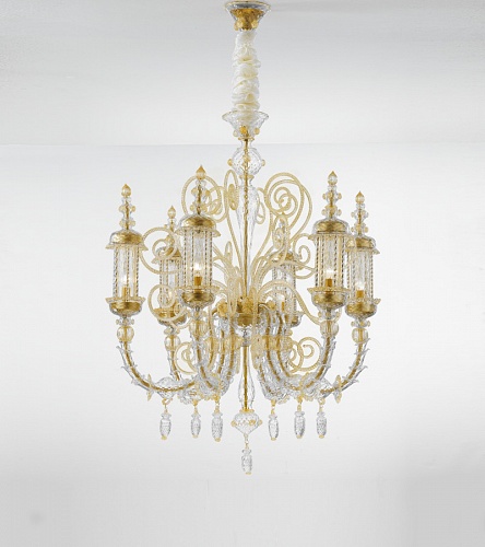 Подвесные люстры SYLCOM. BUCINTORO Модель 1798/6/PO/CR/ORO, позолоченная металлическая конструкция, отделка хрустальным стеклом и золотом 24 карата, H=1260 мм D=970 мм, под лампы 6xE14 40W.
