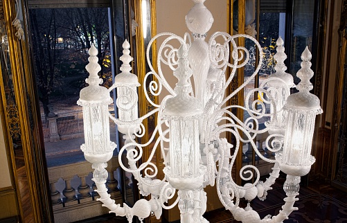 Металлическая конструкция покрыта порошковым серебром или золотом (по выбору). Доступные цвета отделки стеклом: аметист и золото 24 карата, слоновая кость и золото, молочно-белый и хрусталь, хрусталь, хрусталь и золото 24 кт., дымчатый и золото 24 кт.
