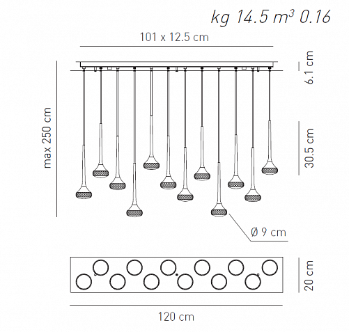 Подвесные светильники AXO Light. FAIRY, Модель SP FAI 12 R CS BR LED, матово-бронзовая отделка с хрустальными плафонами, L=1200 мм, под лампы 12xLED 6,2W 2700K 478lm.