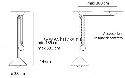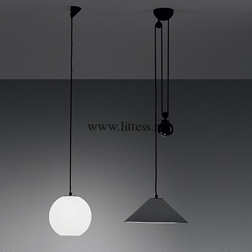 Потолочный подвес из металла и термопластичной смолы, металлический конусообразный плафон окрашен в темно-серый цвет. Регулируемая яркость освещения.