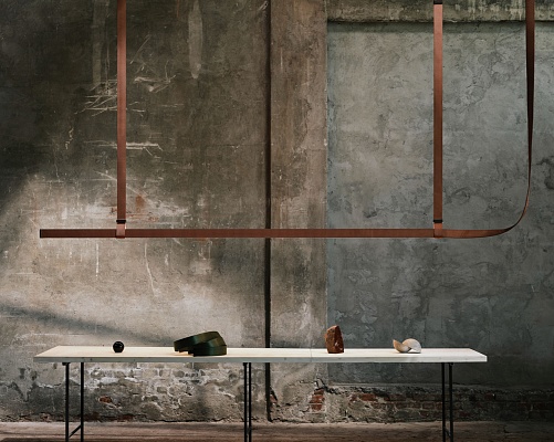 Изделие устанавливается с помощью кожаных или тканевых ремней для подвешивания профиля освещения, продевая ремни через специальные металлические застежки, которые действуют как крючки на потолке. Электрическое соединение скрыто внутри кожаного или фабричного чехла.