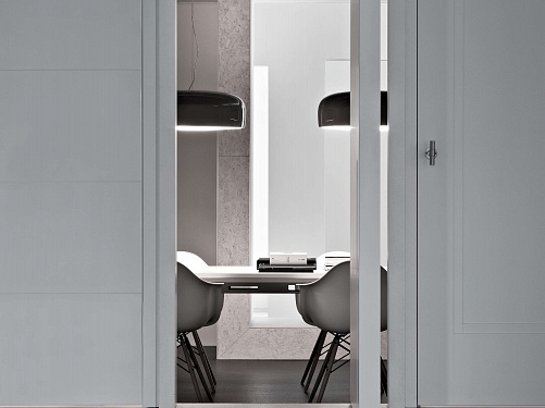 Подвесной светильник с прямым освещением. Алюминиевый корпус. Опалесцирующий метакрилатный диффузор, отлитый под давлением. Стальное потолочное крепление со стальным подвесным тросом, 5-полюсный электрический кабель в двойной изоляции из ПТФЭ, рабочая длина 2700 мм.