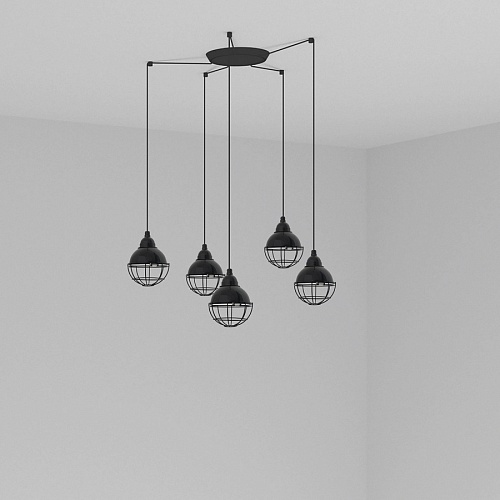 CLAIRE - подвесная люстра с круглыми металлическими конструкциями с черной плетеной рамой. Его дизайн вдохновлен огнями рыбацкого корабля. Версия с 5-световыми навесами.