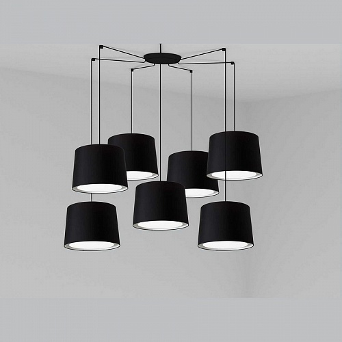 Версия с 7-световыми навесами. CONGA - это коллекция светильников для внутреннего освещения, разработанная Faro Lab. Черная подвесная люстра с текстильными абажурами предназначена для освещения спален и гостиных. Это хороший выбор для отелей.