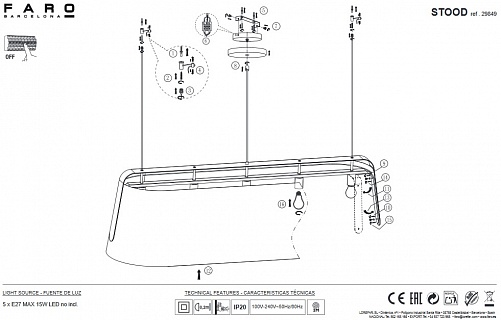 Подвесные светильники Faro. STOOD, арт 29849, цвет черный/древесный, размеры 1510x460x470мм, под лампы 5xE27 max 15W LED