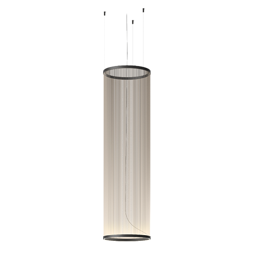 Коллекция, состоящая из множества тонких нитей, туго натянутых между двумя алюминиевыми кольцами, представляет множество элегантных конических и цилиндрических силуэтов, которые соблазнительно переливаются над головой, создавая ощущение изысканности, которым можно наслаждаться в любом контексте.