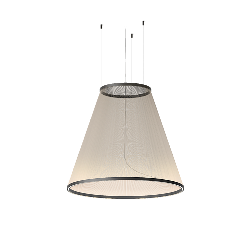Коллекция, состоящая из множества тонких нитей, туго натянутых между двумя алюминиевыми кольцами, представляет множество элегантных конических и цилиндрических силуэтов, которые соблазнительно переливаются над головой, создавая ощущение изысканности, которым можно наслаждаться в любом контексте.