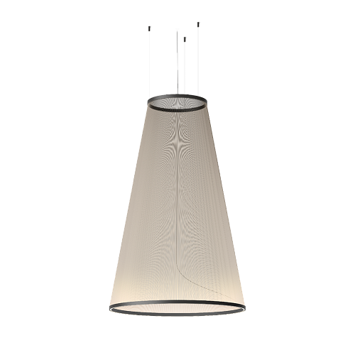 Коллекция, состоящая из множества тонких нитей, туго натянутых между двумя алюминиевыми кольцами, представляет множество элегантных конических и цилиндрических силуэтов, которые соблазнительно переливаются над головой, создавая ощущение изысканности, которым можно наслаждаться в любом контексте.