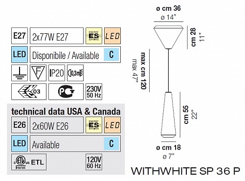 Подвесные светильники Vistosi. WITHWHITE SP 36 P, цвет белый, плафоны из выдувного стекла в атласной отделке, размер 830x360мм, под лампы 2xE27 77W