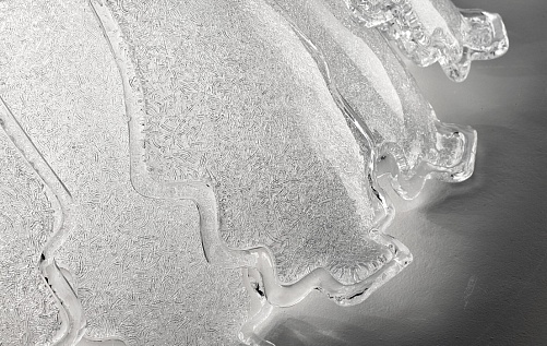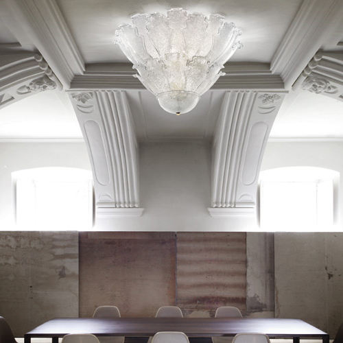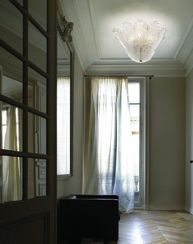 Воспроизводит классическую форму листа, обогащенную новым декором из стеклянных нитей, с каймой из литого стекла, тем самым сочетая в себе красоту неповторимого светового эффекта и функциональность скрытого источника.