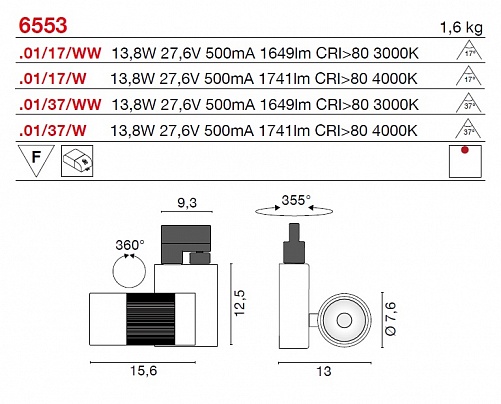 Шинные системы освещения Egoluce. GALILEO, арт 6553-01-37-WW, поворотные, цвет белый, под LED 13,8W 27,6V 500mA 1649lm CRI>80 3000K, луч 37°