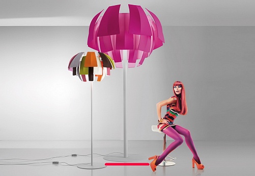 Торшеры AXO Light. PLUMAGE, Модель PT PLU 180 E27 FU XX, белая конструкция с абажуром цвета фуксия, H=3000 мм D=1800 мм, под лампы 6xE27 70W.