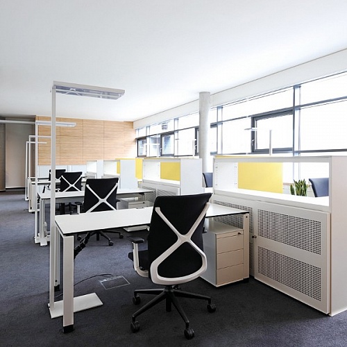 Напольный светильник прямого-отраженного освещения. Оптика выполнена из прозрачного поликарбоната + PRISMOPTIC диффузор. Световой коэффициент до 77%. Распределение света: 32% прямых и 68% косвенных.