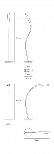 Основание из стали, структура из гидравлического вытяжного металла, рассеиватель из термопластичного материала. Регулируемый поворот по вертикали до 350°. Сенсорный диммер на стебле торшера.