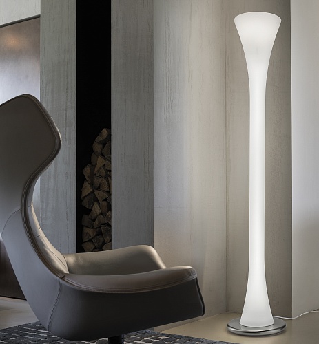 Торшеры Vistosi. LEPANTO PT BC/PU NI, основание матовый никель, цвет стекла глянцевый белый, H=1800 мм, переключатель ON/OFF, под лампы G5 18W и E27 77W.