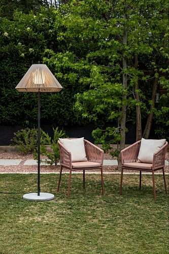 SAIGON - это набор дизайнерских ламп от Nahtrang для наружного освещения. Он отличается простотой и непорочностью образа. Это торшер с бежевым абажуром высотой 2 метра. Абажур сделан из веревки, которая пропускает свет, создавая красивый световой эффект.