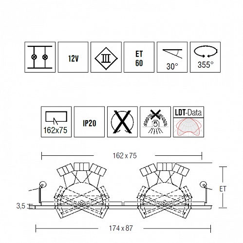 Встраиваемые потолочные споты Brumberg. 20002/12158/33158, арт 20002070, цвет белый, L=174 мм, под лампы 2xGX5,3 QRCBC51 50W 12V.