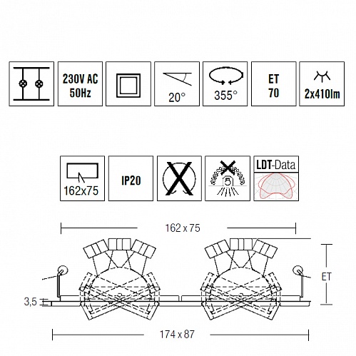 Встраиваемые потолочные споты Brumberg. 20002/12158/33158, арт 33158073, цвет белый, L=174 мм, под лампы 2xLED 6,6W 2700K 410lm 220V.