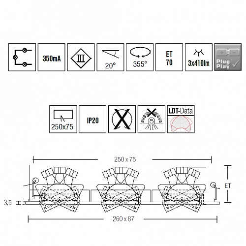 Встраиваемые потолочные споты Brumberg. 20003/12159/33159, арт 12159253, цвет алюминий, L=260 мм, под лампы 3xLED 6,6W 2700K 410lm 350mA.