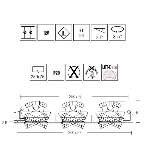 Встраиваемые потолочные споты Brumberg. 20003/12159/33159, арт 20003070, цвет белый, L=260 мм, под лампы 3xGX5,3 QRCBC51 50W 12V.