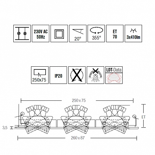 Встраиваемые потолочные споты Brumberg. 20003/12159/33159, арт 33159073, цвет белый, L=260 мм, под лампы 3xLED 6,6W 2700K 410lm 220V.