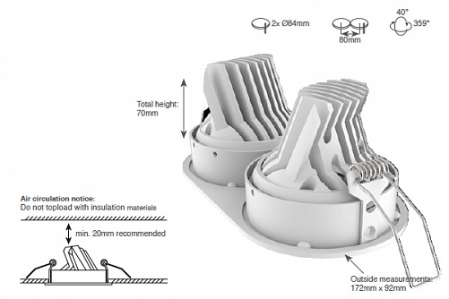 Светодиодные модули в комплекте. Блок питания (350mA) не входит в комплект поставки. По запросу доступны версии со световой температурой 3000K или 4000K и отражателями с углом рассеивания 40°.