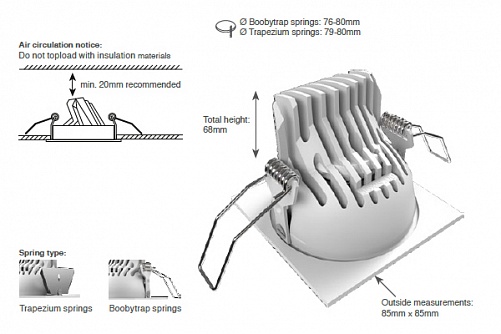 Угол рассеивания луча 28°. Светодиодный модуль с 10 диодами. Пассивное охлаждение (без вентилятора). Крепление с помощью трапециевидной пружинной рессоры (рессора клипса по запросу).