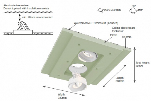 Угол рассеивания луча 28°. Светодиодный модуль с 10 диодами. Пассивное охлаждение (без вентилятора). Настраиваемый наклон до 30° и поворот до 359°. После монтажа светильника, шов стыка между потолком и светильником нужно заштукатурить.