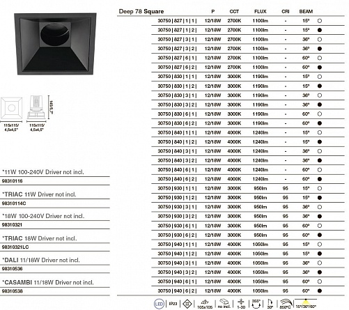 Встраиваемые светильники Faro. DEEP MEDIUM 78 SQUARE, арт 3075082712, цвет черный, под лампу COB LED 12/18W 2700K 1100lm 15°, 500mA.