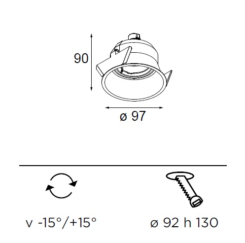 Монтаж в бетонный потолок. Регулируемый вертикальный поворот -15°/+15°.