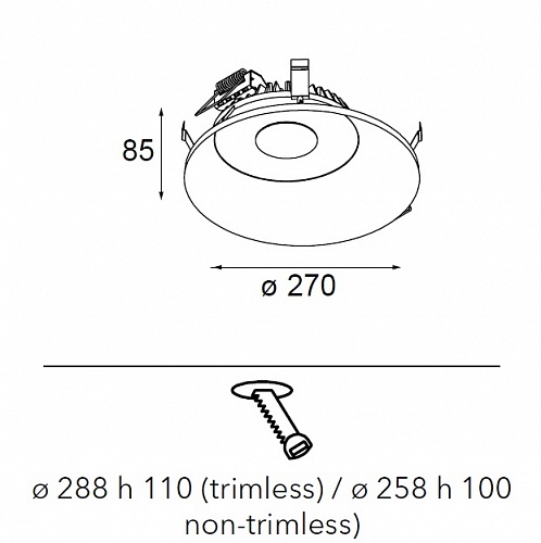 Установка светильника в гмпсокартон (подвесной потолок), бетон (или кирпичную стену) с использованием монтажного короба возможна лишь в комбинации со встраиваемым кольцом. В этом случае необходимо большее отверстие для установки: D=288 H=110мм.