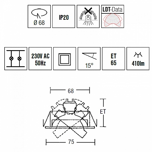 Регулируемый наклон до 15°. Угол рассеивания луча 38°.