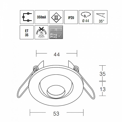 Установка в подвесные потолки с помощью рессорной фиксации. Регулируемый наклон до 35°. Угол рассеивания луча 15°.