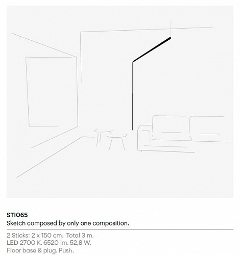 Встроенный источник света. Подключение Floor base & plug. Push. Композиция состоит из 2-х модулей Sticks: 2x1500 мм.